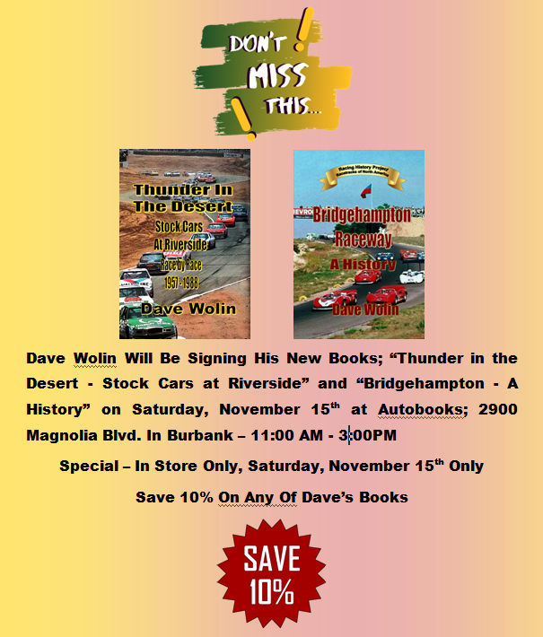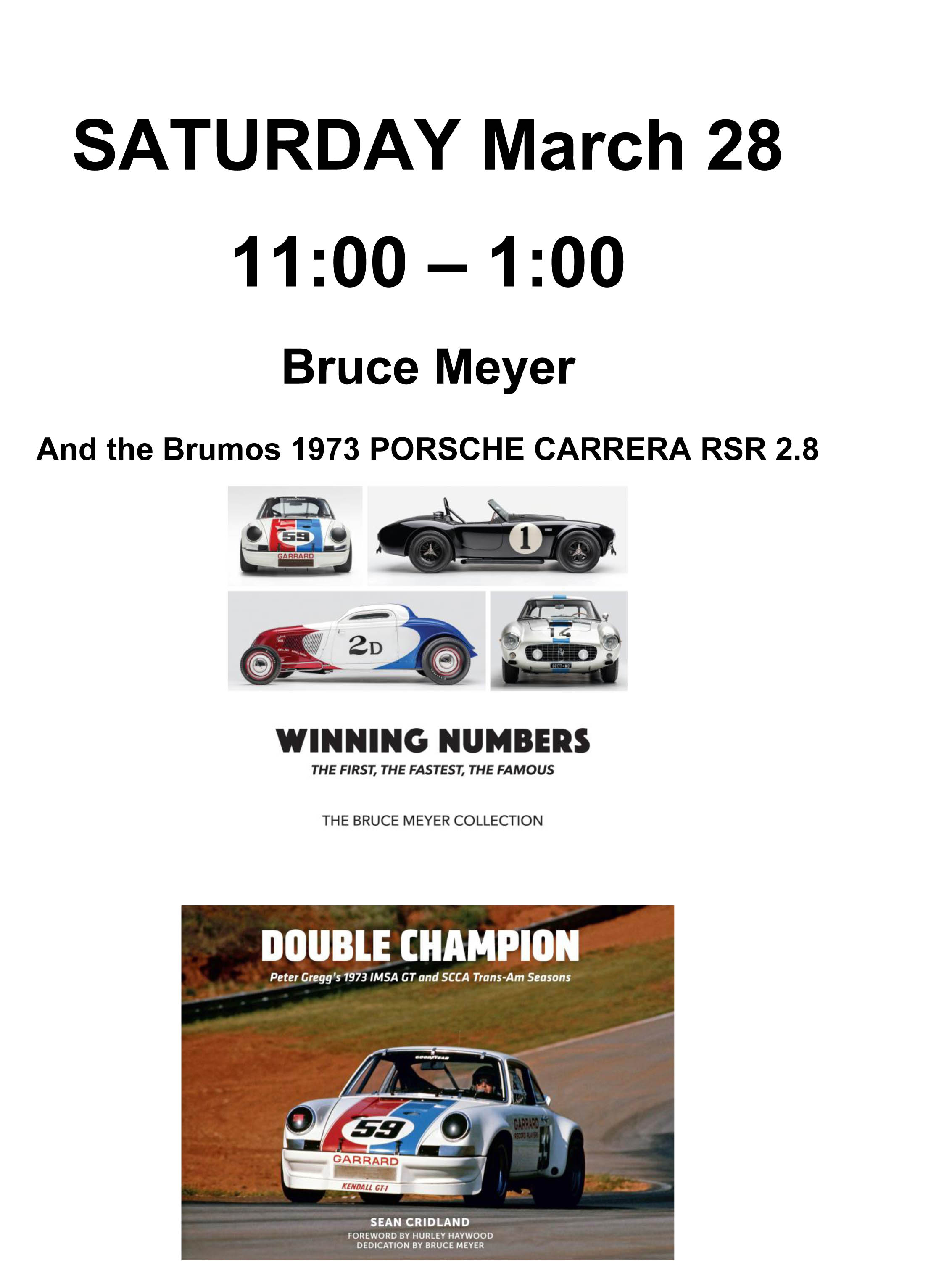 Tina sent a notice that Bruce Meyer would have the Brumos Porsche at Autobooks on March 28: