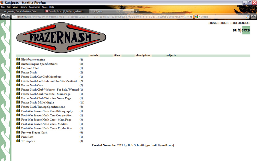 You can click on any of the small images or the Acrobat icon to see the full document or image. If you click on the "page" to the left of these, you may see Greenstone's text of the same document, if available. Next to the first image is the name of the image file, the car "make" and the original photo date. These are meta-data items. The file name and photo date are automatically extracted from the image or document. You can go back to the main screen again and enter the "Fabulous Fifties" newsletter collection or the Petersen Automotive Museum collection and search or browse in a similar manner. At this time, the indexing and categorization in these collections is not entirely consistent or complete, but these samples should nevertheless demonstrate Greenstone's potential. With more experience, categorization skills will improve! More important - it's highly desirable that a community of users consider and settle on standards for "titles", "descriptions", and "subjects". "Car.make", "car.manufacturer", and "car.year" are much easier to understand! Collection Contents 1. The Fabulous Fifties collection consists of 48 newsletters and special announcements from this "non-club" organization. They are in PDF (text and image) format and can be searched in full-text by Greenstone. 2. The Petersen collection includes a few static web pages, photos of their current exhibits and some digital assets in a group titled Digital Library Collection. A list of the video interviews done by Bill Pollack are part of these digital assets. The Digital Library Collection also includes early auto periodicals. Eight years ago Bob Norton (gone from us too early) embarked on a massive scanning project of early west coast racing newsletters and magazines. Less than 25% of his work is included in this Petersen sample collection. Bob made a full 28 page index of the 9 volumes of "MotoRacing" (Index.pdf) which was text-rich and searchable, including in this Greenstone sample collection. The PDF files of the documents in the Norton segment otherwise are "image only", not text-searchable. However, these PDF images can by put through OCR software to generate text. One page of one copy of MotoRacing was processed using ABBY FineReader and it worked very well, with about 95% accuracy. 3. The Frazer Nash collection includes a complete list of the prewar (chain-drive) and postwar Frazer Nash cars. The details of these cars, in an Excel file, is now "metadata" that makes the addition of other photos and documents much easier and consistent. There are also approximately 100 Frazer Nash images and documents in this collection, still only a fraction of my personal files. Email me with any comments or questions: Bob Schmitt, rgschmitt@gmail.com |