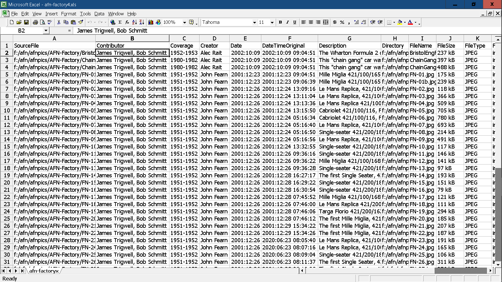 This is the screen after running the ExifTool command: This is the resulting CSV file, opened in Excel: This shows there is very little metadata any file. 5. Because the files have the same data in common, selected metadata was added directly to multiple files with the ExifToolGUI For example, John Fearn was the photographer. The location of the A.F.N. factory was London Road, Isleworth, England. James Trigwell, author of "The Post-War Frazer Nash" provided the "captions" - title, description, subject - for each photo. This screen image shows all files selected with such metadata ready to add: 6. The ExifToolGUI was further used to fill in missing metadata. If several files required identical data to be added, those files were highlighted and such data was added. 7. Embedded metadata can be verbose! In the photos sent by John Fearn, this was added to the DC:Source category:
