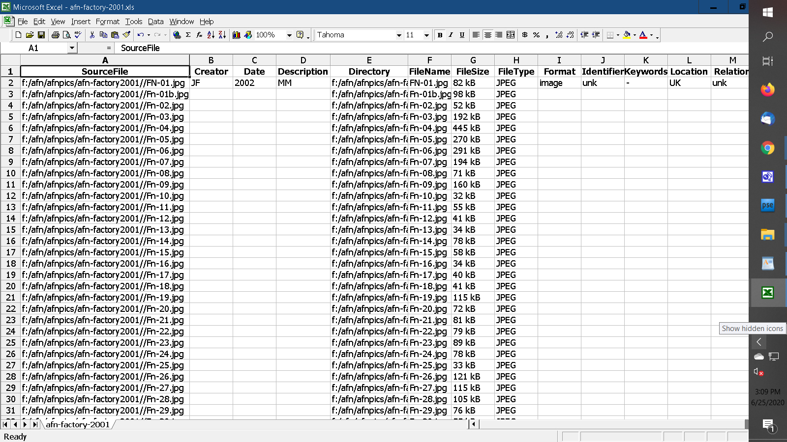 This embedded data is 96 words and 527 characters! 8. To conform to "best museum practice", an accession number was easily added as a column in the Excel table (as above) as "Identifier" (unique ID). A basic Excel function will create a series of numbers, such as 1951.3.1, 1952.3.2, etc. thus avoiding tedious individual additions. 9. An Excel "input" file was created to update two columns (categories) of metadata: "Identifier" and "Date", to match the "DateTimeOriginal". 10. The Excel files was "saved as" a CSV file and then used to update all images. 11. The ExifTool command to write this updated metadata to the files in the folder was: exiftool -csv=afn-factory-input.csv-ext jpg f:/afn/afnpics/afn-factory/ 12.This is the spreadsheet that shows the full extent of the metadata: A.F.N. Ltd Factory Photos, 1952