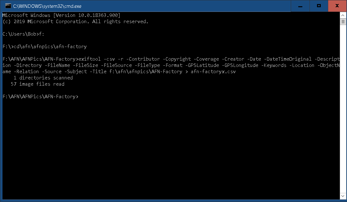 The right panel of this ExifToolGUI screenshot shows the metadata categories are filled: To see the status of metadata in the AFN factory photos, this was done: 1. Press the "Windows" key and "R". This returns the Windows command prompt. 2. Change to the directory where the photos are located: "f:/afn/afnpics/AFN-Factory" 3. Then run this at the command prompt: