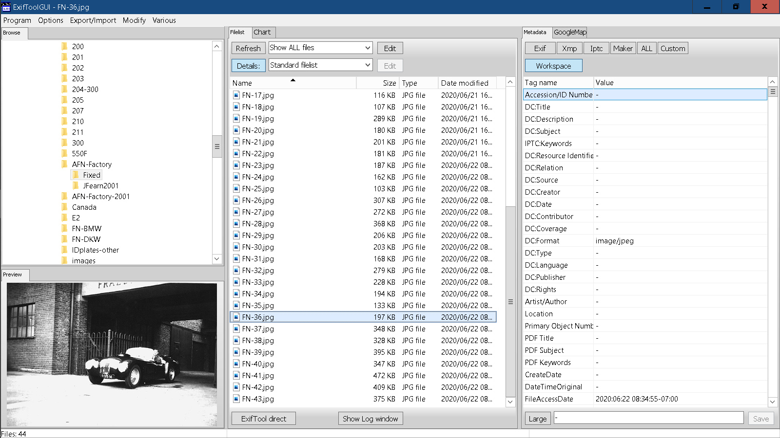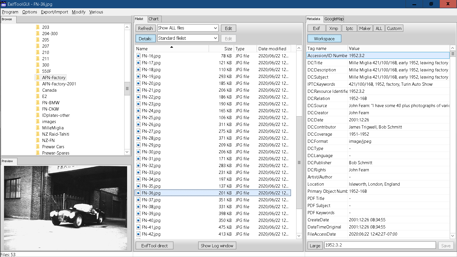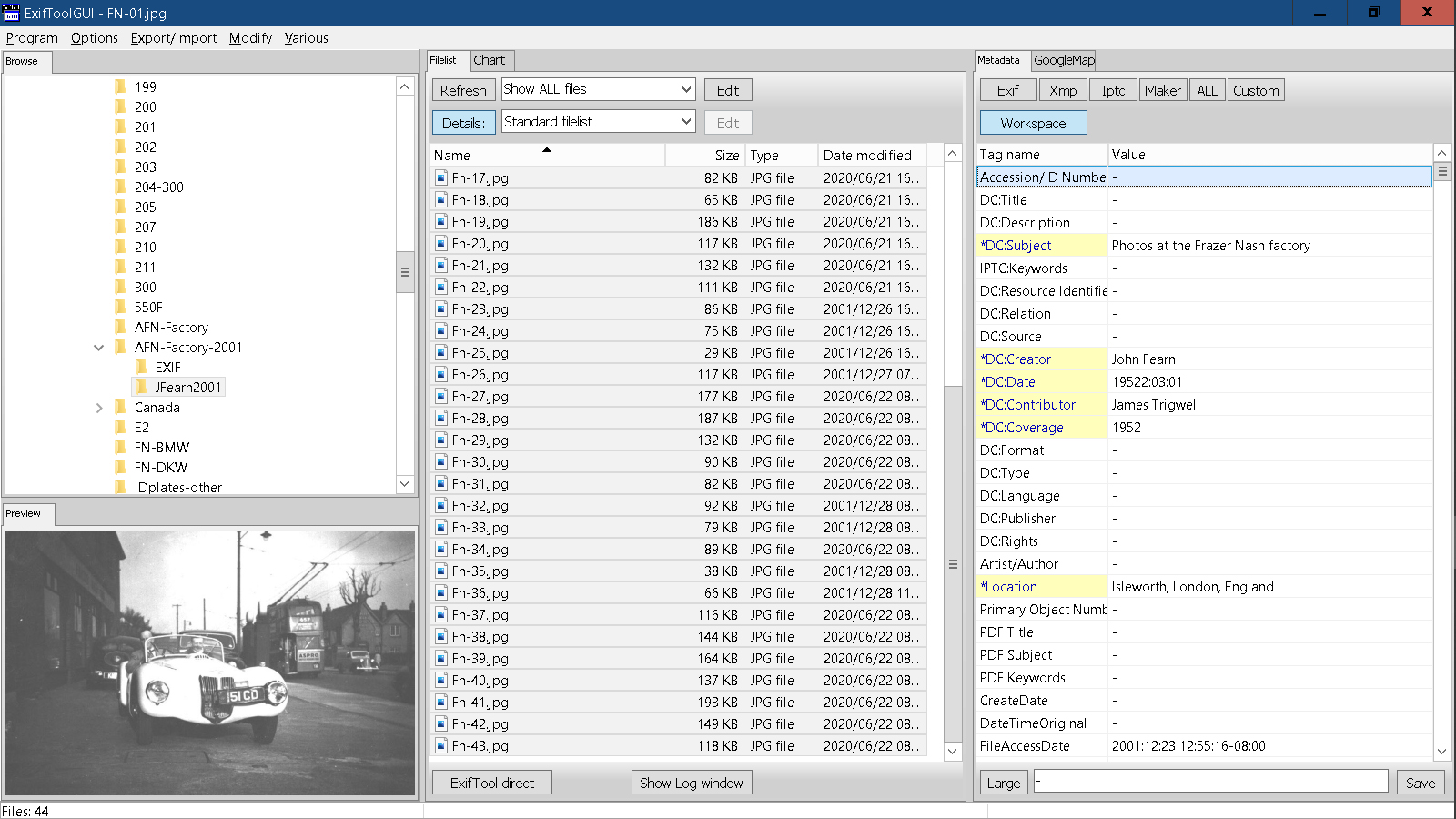 This webpage uses "before" and "after" photos taken at the Frazer Nash factory in 1952 to show that metadata can be embedded in these photos to preserve date, location, car ID and other data for historical purposes and to ease creation of traditional inventories, Collections Management Systems (CMS) and digital archives. The open-source ExifTool software and the open-source add-on program, the ExifToolGUI (Graphical User Interface) are used to improve the identification - and eventual classification - of these digital photos. The steps are the same for documents scanned to image formats and PDF files. "Embedded metadata" is the goal. What is Embedded Metadata? Definition: Metadata, embedded Embedded metadata is a component of a digital file that exists alongside the content (usually binary data) within the file, making the digital file self-describing. In the realm of still images, embedded metadata may conform to specifications like the following: Exif, IPTC Metadata, TIFF Header and XMP. Other elements or chunks found in non-still-image file formats play similar roles. Resource: Sue Chastain article on metadata in graphic images - http://graphicssoft.about.com/od/glossary/f/metadata.htm Information from the Metadata Working Group - http://www.metadataworkinggroup.org Software Metadata can be added to photos in many photo editing programs, such as Photoshop. This webpage describes using the open-source program, the ExifTool. The ExifTool can be used: