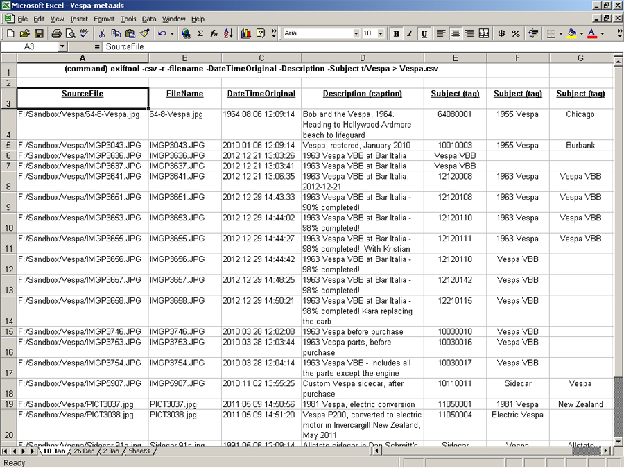 ABBYY FineReader 6.0 Sprint Plus OCR software was used to convert the JPG files and TIFF files to separate PDF files. No metadata was evident when inspected by ExifTool. It isn't clear whether this lack of metadata is a quirk of the file structure, or Picasa, or Fine Reader. A second document was scanned directly into a 6-page PDF file. There were no obvious steps in the scan process, either through the Epson scan software or through Picasa, to put metadata into the PDF file. None was found through ExifTool. However, the Lightning PDF editor was able to add metadata to the file through the "properties" function. The metadata was confirmed in ExifTool and was further edited (added to) in this program. A further test was conducted with an 8-page advertising brochure, scanning to a multipage TIFF file. Again, the metadata added in Picasa was not visible in ExifTool nor did it show up after conversion by FineReader to a PDF file. However the scanning to TIFF and conversion seemed faster than the single page trials and the result was an archive TIFF file (sizable!) and a Greenstone-ready PDF file, in which metadata was added in the Lightning PDF editor. This process is workable. Although the TIFF file format has been recommended as an archive standard, archive organizations also have recently stated that the "PDF/A" format is also a reliable archive standard. PDF/A is an open, internationally recognized document standard for completely self-contained documents that can have embedded metadata (XMP format) and searchable text. LibreOffice can create of PDF/A documents through an option to its "Export as PDF..." menu choice. A 2-page Word documents was exported as a PDF/A, with metadata added in the LibreOffice "Properties" menu choice. The metadata was confirmed in ExifTool, the document was added to the "Vespa" Greenstone collection (same as above) and was correctly classified and displayed through this embedded metadata. A reply from ABBYY FineReader technical support stated that the "Professional" version supports PDF/A and has a menu option to embed metadata. A trial version of this software was tested with an Epson scanner on image, text and mixed text/image documents - see below. Adding MetadataWith Other Programs Two other free programs seem potentially very useful to better identify digital photos: "ReNamer" and "ExifTool". ReNamer can change the file name for an entire folder of photos in many ways, including adding metadata. For this sample group of photos, the caption was temporarily added to the file name as a prefix or suffix by selecting "ITPC Caption" choice. If the only the "accession number" was put in the Picasa caption, this data could be easily added to a group of photos. The EXIFTool The second program, Phil Harvey's ExifTool, is described to have the ability to extract, add, copy or move nearly all types of metadata. The basic program must run from a command line, but with the correct configuration, it is very powerful and promises to "do everything" A download and very complete explanation of its functions are here. It soon will be tested using the command line functions. Bogdan Hrastnik has written a GUI (Graphical User Interface, Windows only) for ExifTool, which allows very easy access to many of the ExifTool functions. The "how to" and download page for ExifToolGUI is here. 10 more digital images were added and ExifToolGUI was used to see if "captions" and an "ID number" can be readily embedded in each image. This was very easy to do in the "IPTC edit function" window. These images were then brought into a new Greenstone collection, titled "Vespa" and the (new) captions were extracted from the "IPTC.Caption-Abstract" metadata item. The trial ID numbers were extracted and displayed from the "IPTC.ObjectName" metadata category. This is one solution for adding important data in digital photo archiving! Figure 2 - Note the file now has "Object ID", added by by using the "ExifToolGUI". This screen shot shows browse results on "Alternate Captions" starting with "1". The "Alternate Caption" is from "IPTC.Caption-Abstract" and the "Caption" is from "XMP.Description", as described above. The ExifTool and ExifToolGUI will display and edit the metadata for any file. PDF files, Word and Excel documents, music and video files all have embedded metadata. Check your files and you may be surprised! The ExifToolGUI was used to correct some old captions embedded by Picasa and then this software created an Excel file (similar to Figure 3 below) showing each record in the file with its metadata. The Excel "text to columns" function was used to separate multiple Tags into separate columns. Therefore, a unique ID/accession number can be added to a digital photo as a "Tag", along with as many other "Tags" as desired and these Tags can be readily separated in Excelcolumns. This results in a very useful Excel file that will show the file name, directory, the caption, an ID number, the photo date and location. This is certainly sufficient for a digital photo archive. A revised Greenstone archive was created with this new data. ExifToolGUI was customized (not difficult!) using its Workspace Manager and User Defined file display to review files, to quickly check their metadata and to make necessary additions or changes. Trials confirm that metadata added in ExifTool can also be viewed in Photoshop Elements and survives file conversions, such as from TIFF to JPG. The screen shot below (figure 3) shows the particular metadata embedded in these test images, extracted by ExifTool from the command line, through the GUI. Note the "SourceFile" shows that these are image files in a Greenstone collection. Although this sample has only image (JPG) files in this directory, this function of the GUI will show the file name and metadata (if correctly specified) for all files. This is a handy way to make a list in the CSV file format, then open that with Excel to annotate or mark files for further action. From